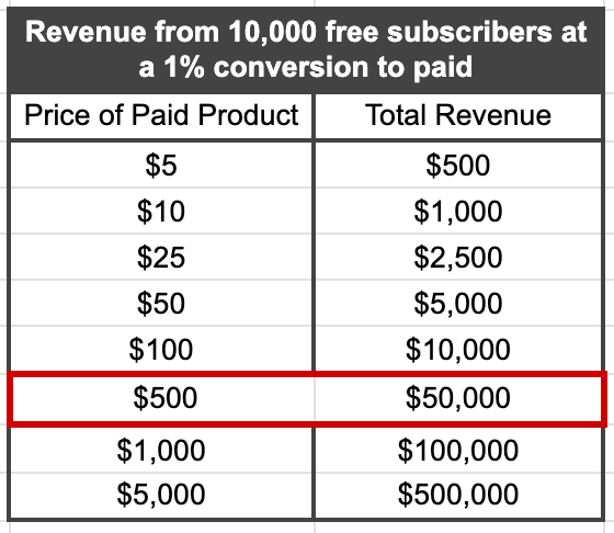 If you have a list of 10k free subscribers and you try to sell them anything, you can reasonably estimate ~1% to ~3% of them will buy.